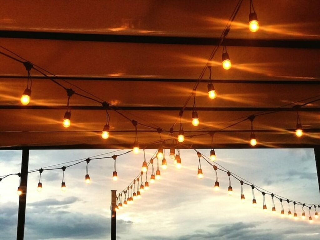 1. A shaded outdoor lounge with chairs, string lights, and maybe a TV